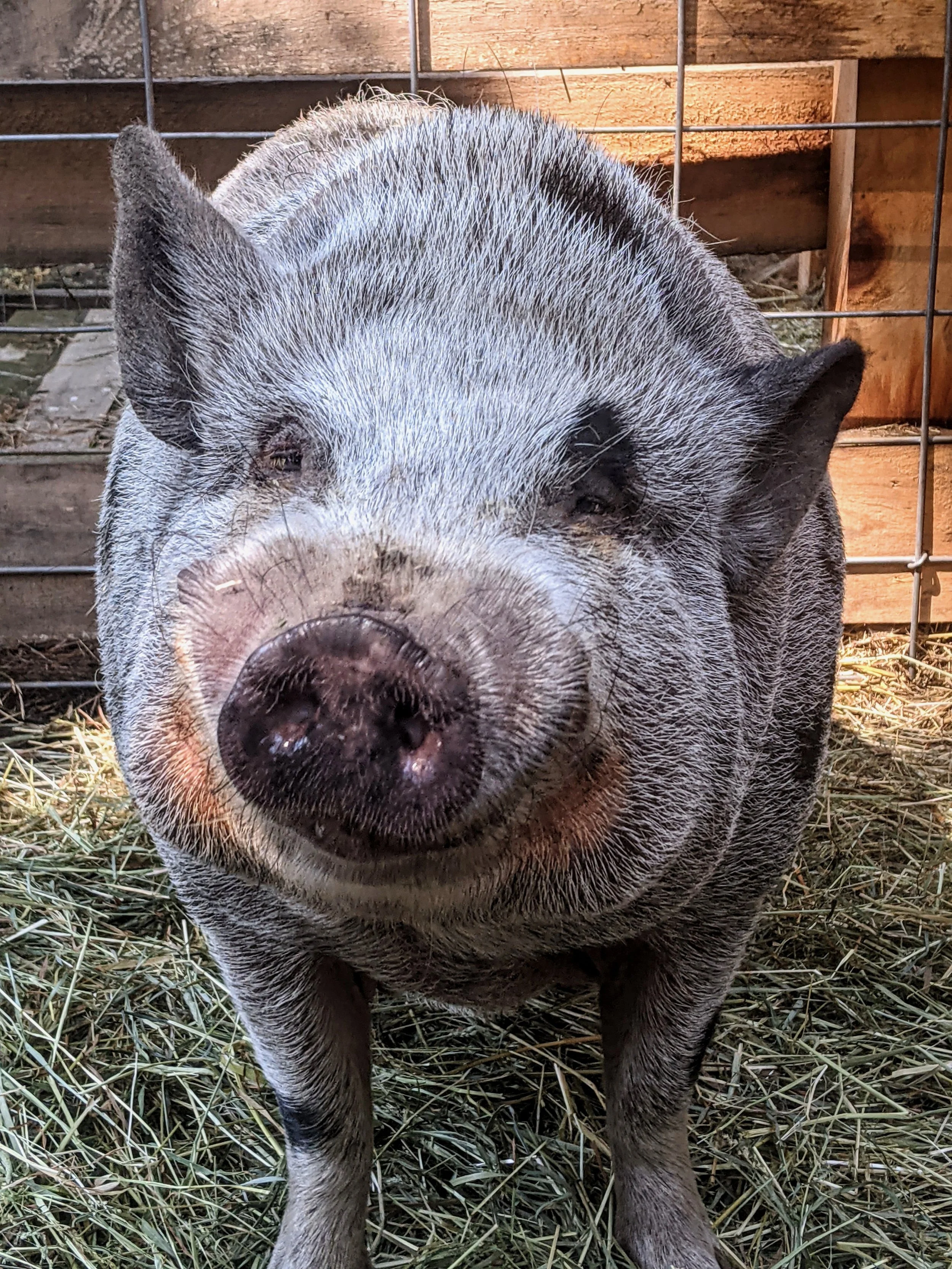Finnegan lived with a family in Brockton. He became much bigger than the family ever expected, and they were not prepared to care for such a big boy so they asked if we could offer him sanctuary. Finn now shares space next to the sweet goats and the wild and sassy ponies. Finn loves treats and back scratches (Don’t we all? Haha!). He is a fan-favorite of most of our visitors as he adores meeting new people and hanging out with old friends.