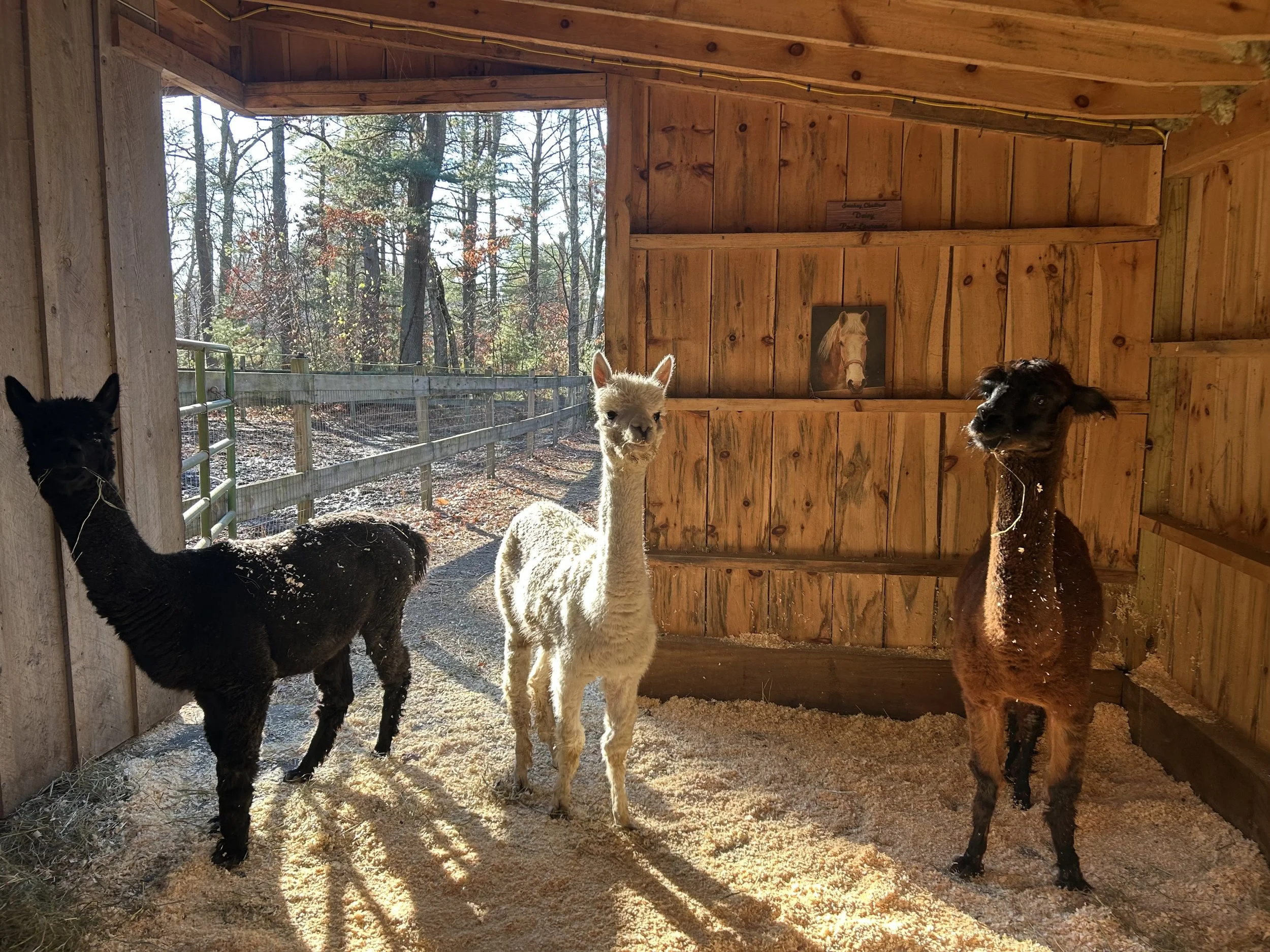 Daisy (center) came to Smokey from a kill buyer in Virginia in 2022. Prior to that, she had been used her whole life for breeding purposes. Unfortunately, a lot of female alpacas are seen as vehicles for breeding, selling the babies, and making money. In 2023, we rescued two more alpacas, Desert Rose (right) and Dahlia (left) who were being relocated due to their physical and behavioral “ineffectiveness” at their previous home. Dahlia can be quite shy; Desert Rose is often wary of others but very very curious; Daisy will come up to anyone with a treat. They may be unique, but their quirks make us love them even more!